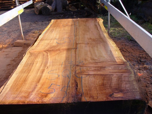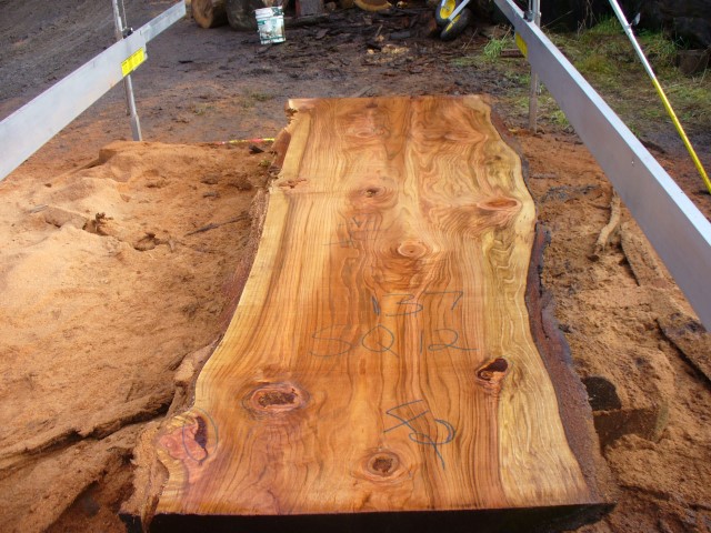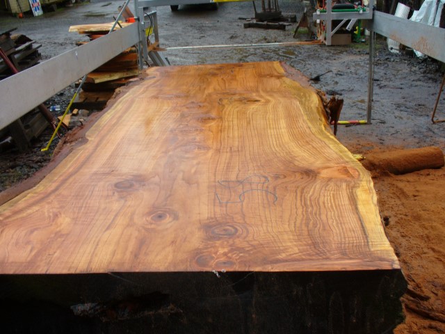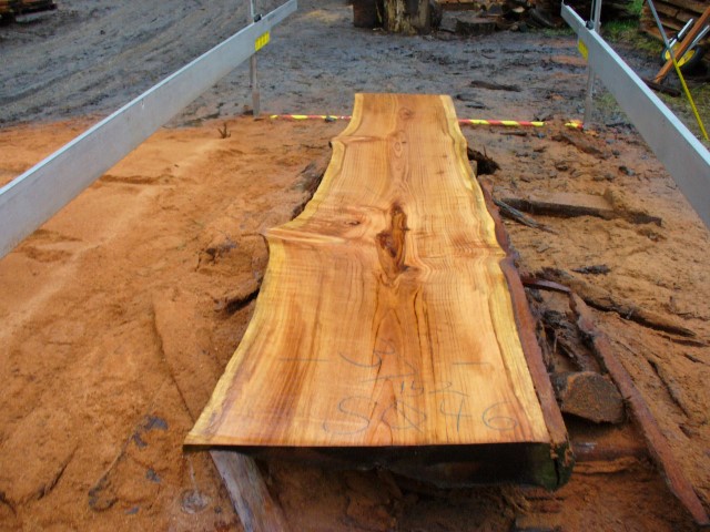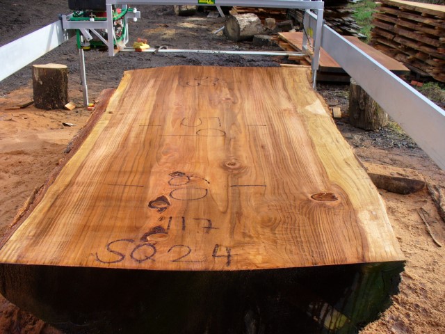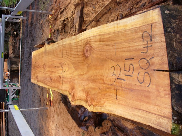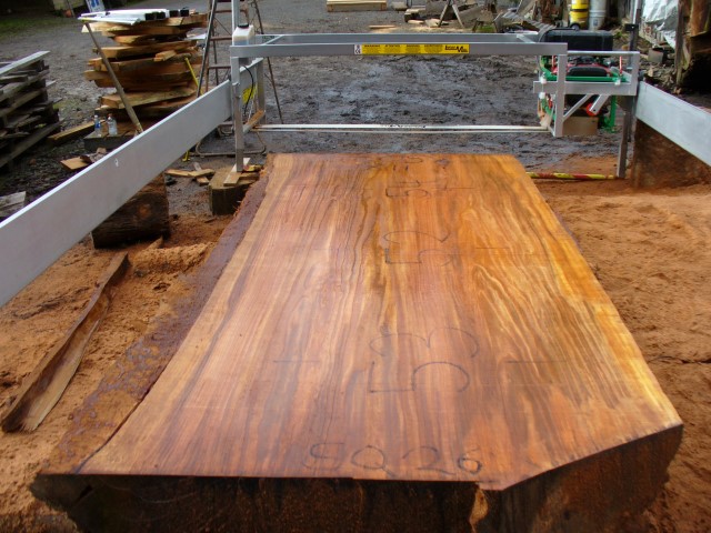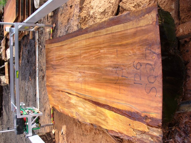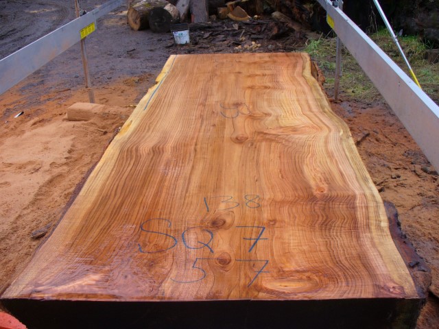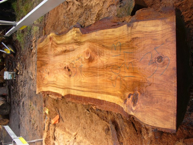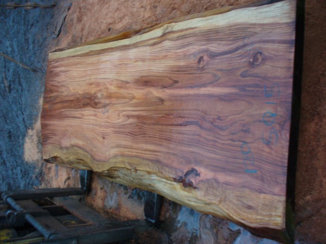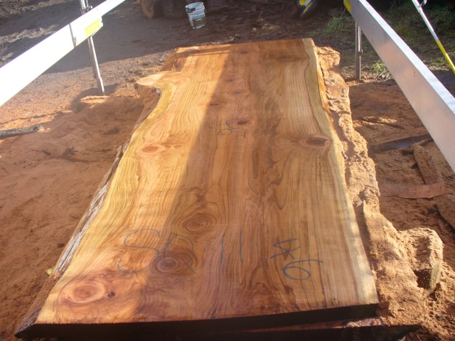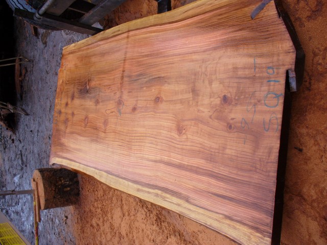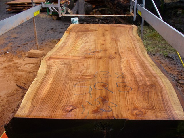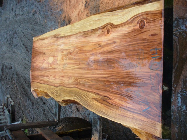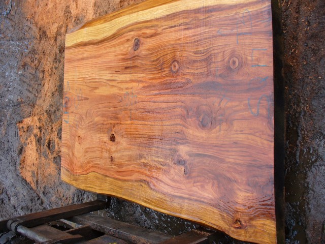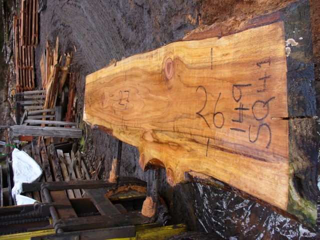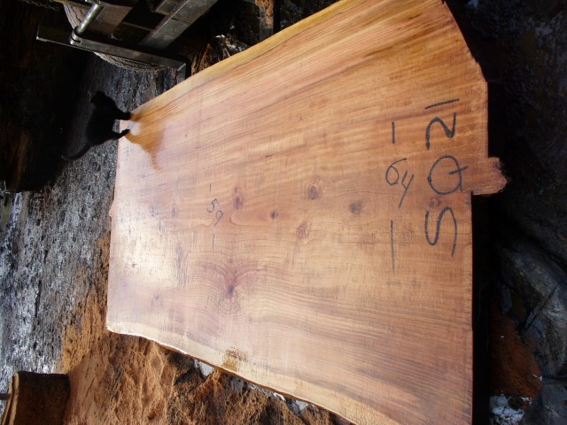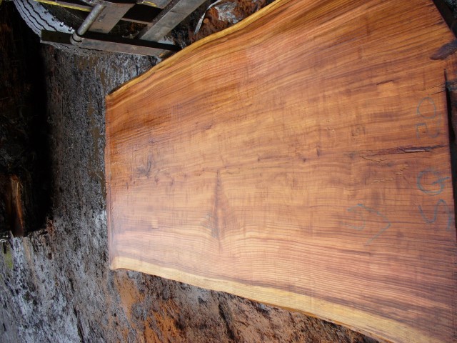 Below is a listing of some of the slabs in our inventory. Each table indicates slab by #, species, date cut and dimensions. All slabs are ~3”thick unless noted otherwise in the comments. Each slab is pictured below with the # and dimensions written on the face. Pictures were taken when slab was cut and when slab was wetted with water to show the appoximate appearance of the slab when finished. Slabs are airdried unsurfaced, and unfinished. In most instances the slabs are numbered sequentially so that the bottom of one slab looks very similar to the next sequentially numbered slab of the same length.