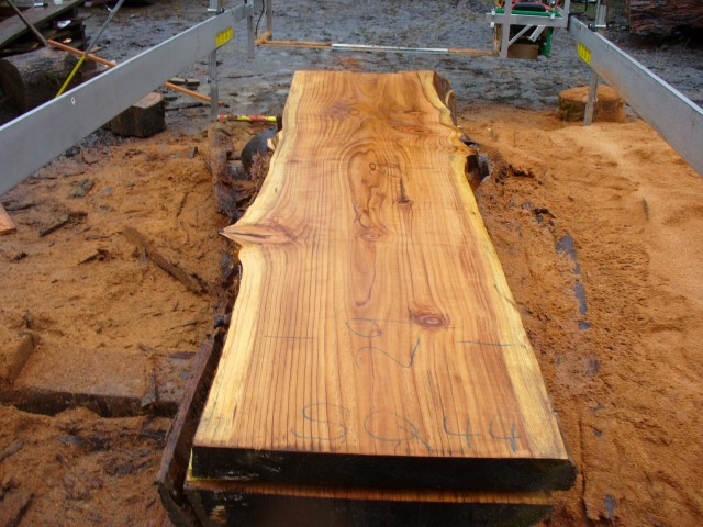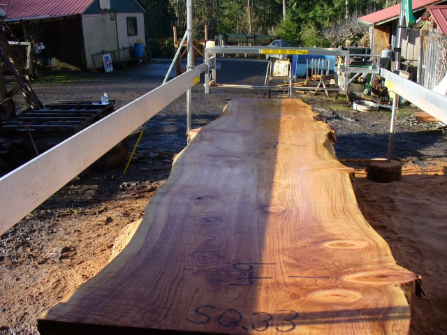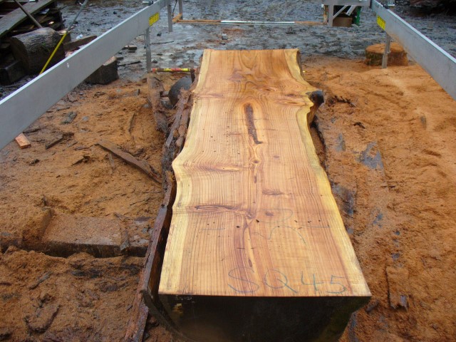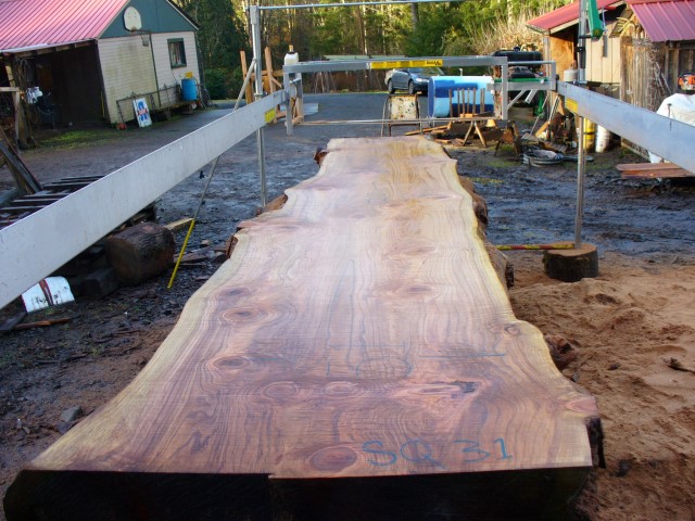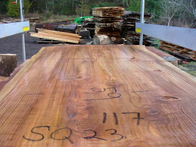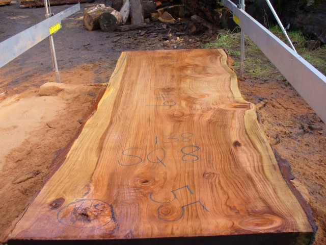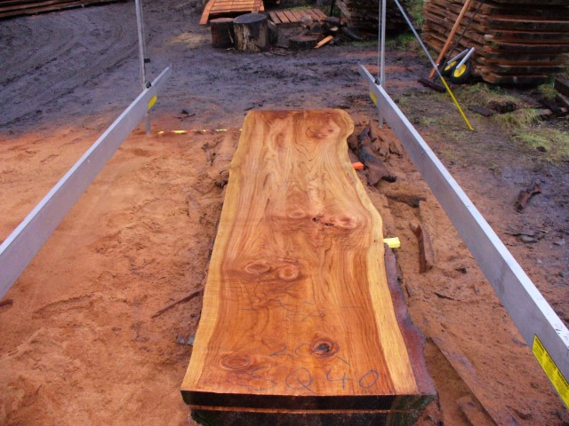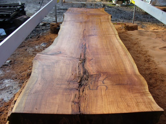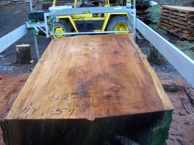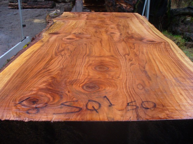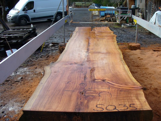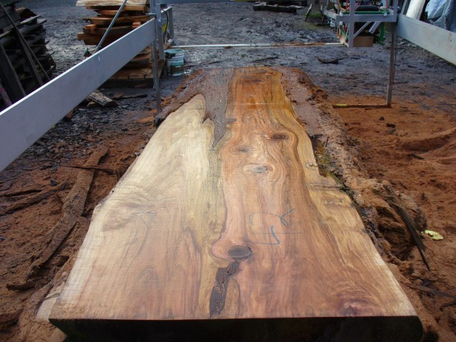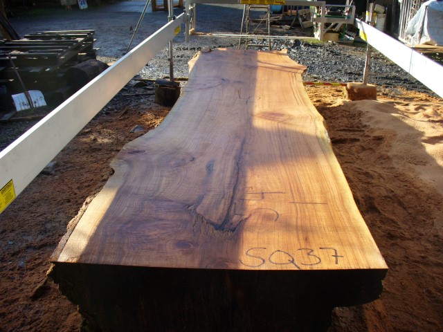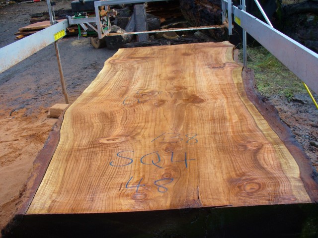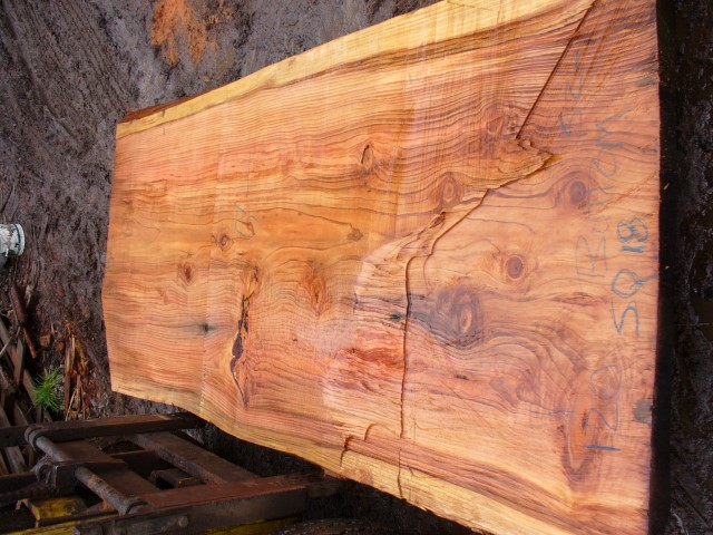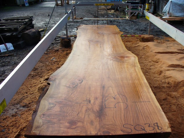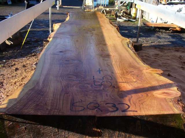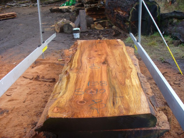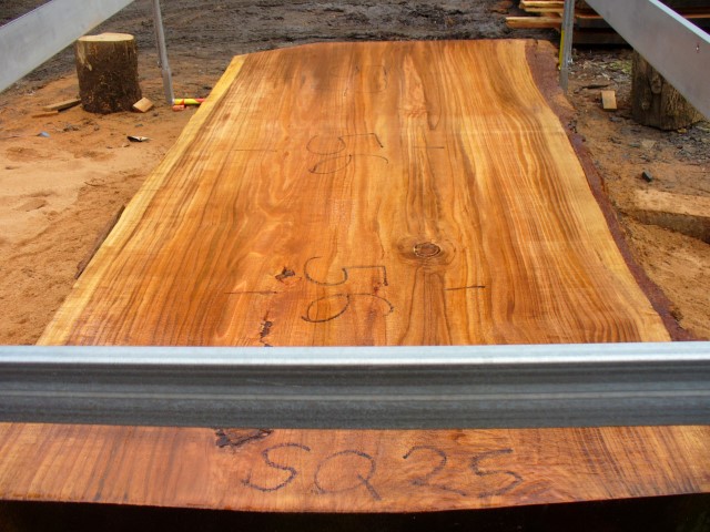 Below is a listing of some of the slabs in our inventory. Each table indicates slab by #, species, date cut and dimensions. All slabs are ~3”thick unless noted otherwise in the comments. Each slab is pictured below with the # and dimensions written on the face. Pictures were taken when slab was cut and when slab was wetted with water to show the appoximate appearance of the slab when finished. Slabs are airdried unsurfaced, and unfinished. In most instances the slabs are numbered sequentially so that the bottom of one slab looks very similar to the next sequentially numbered slab of the same length.